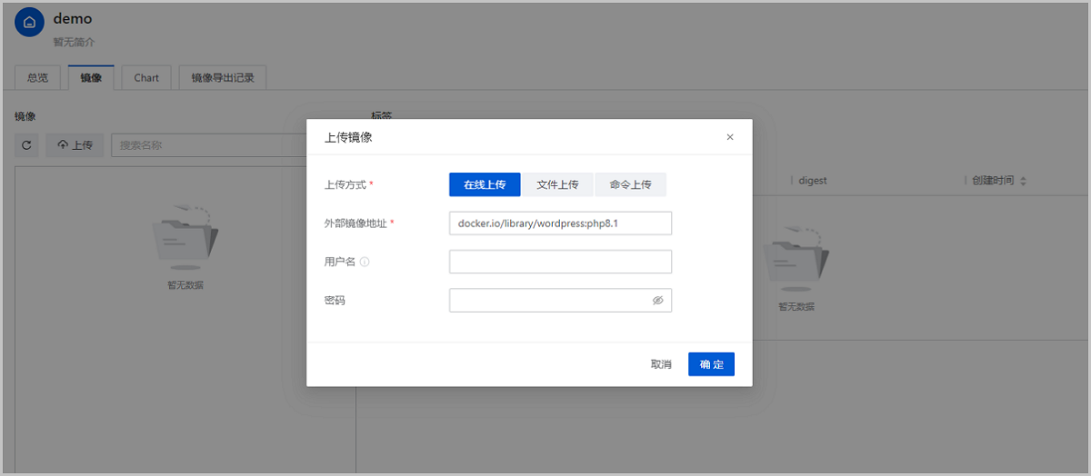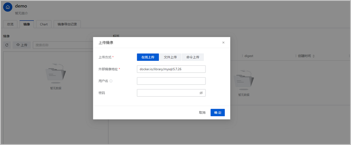 说明: 除在线上传外,ZStack Cube 双引擎版还支持文件上传、命令上传两种镜像上传方式,用户可以将镜像压缩包上传到本地仓库,或通过命令直接将镜像推送到本地仓库,详情可参考上传镜像