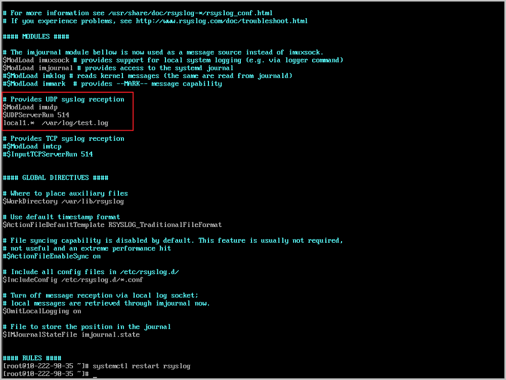 #$ModLoad imudp #$UDPServerRun 514修改为以下内容,表示开启UDP配置:$ModLoad imudp $UDPServerRun 514local1.* /var/log/test.logsystemctl restart rsyslog