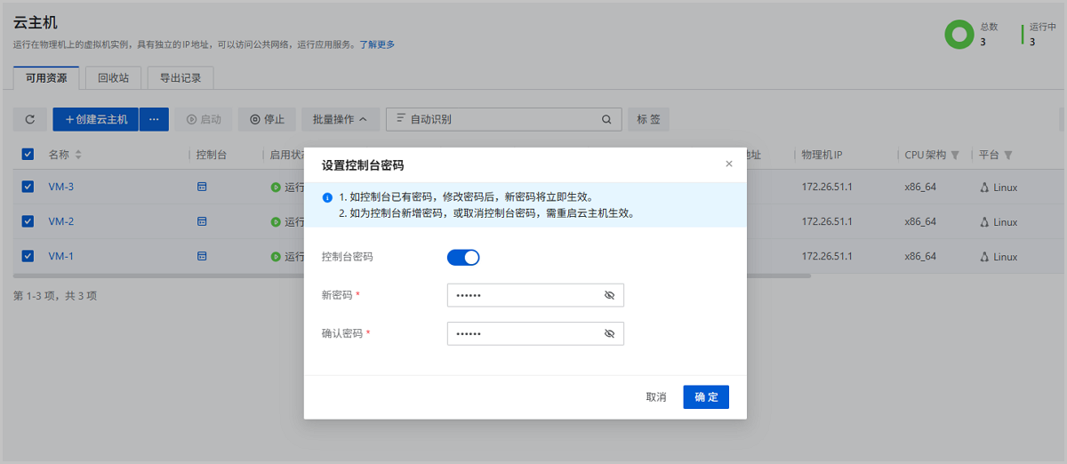 仅在云主机已有控制台密码时,修改已有密码可直接生效。新增/取消密码仍需重启生效。