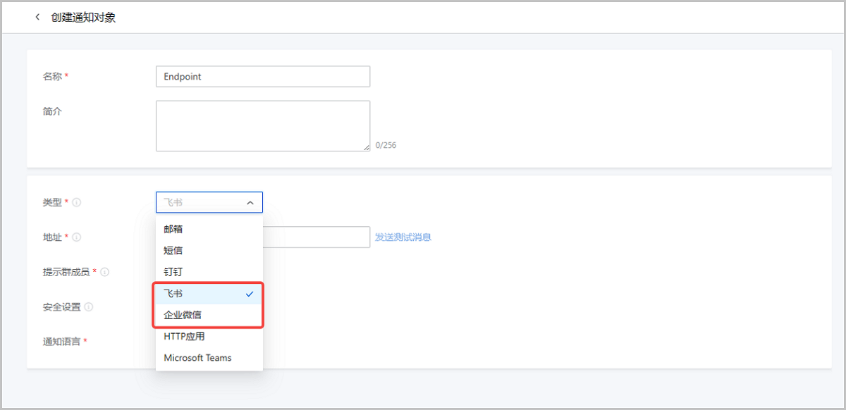 创建资源报警器、事件报警器、扩展报警器、资源分组,或设置一键报警时,均可选择企业微信/飞书类型的通知对象。