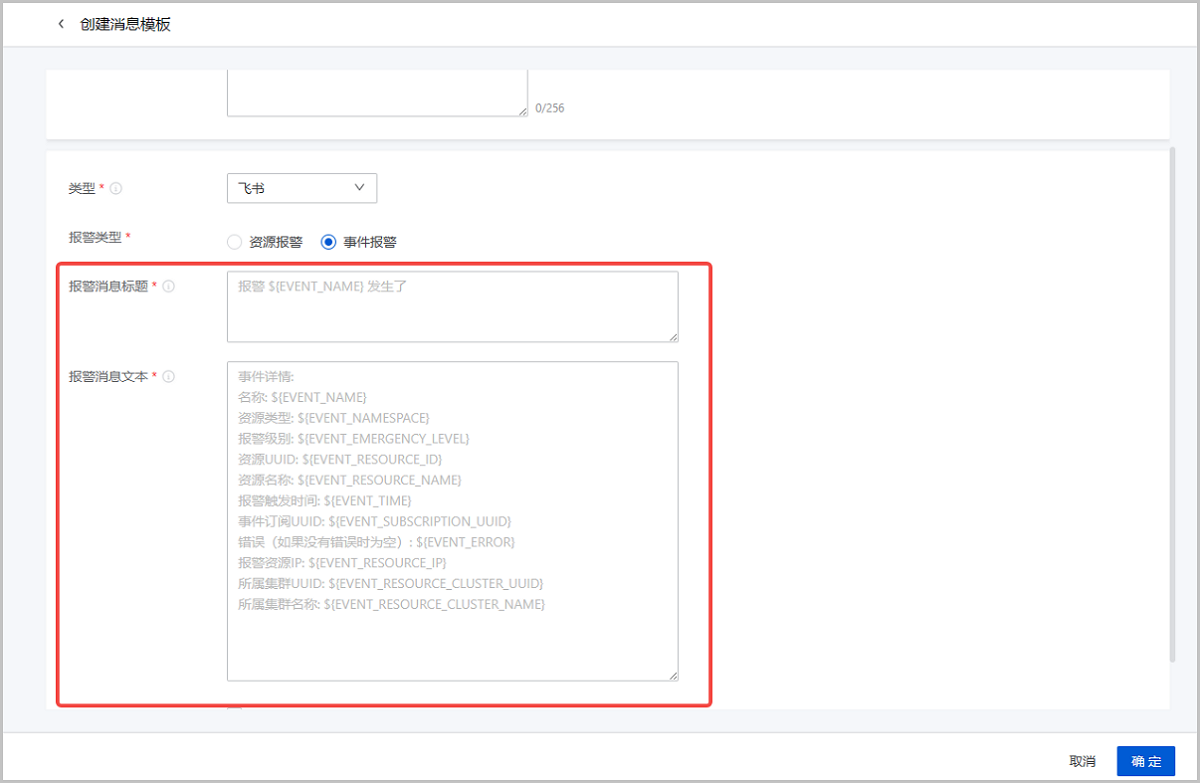 ZStack Cloud 5.0.0开始,邮箱、钉钉、飞书、企业微信、HTTP应用、Microsoft Teams消息模板支持三个新字段:报警资源IP、所属集群UUID、所属集群名称。用户可根据实际情况,在自定义消息模板中增添以上字段,以获取更详细的报警信息。