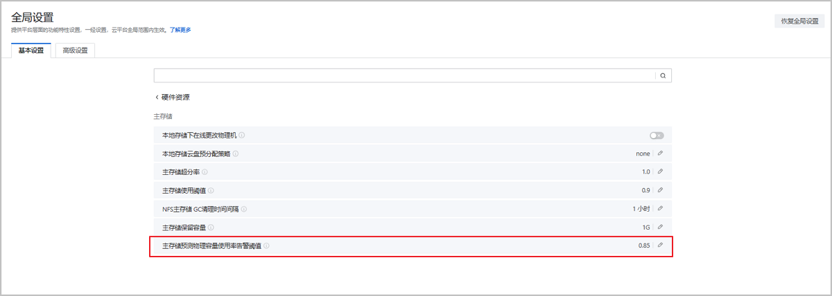 在ZStack Cloud主菜单,进入,即可设置此项。用户也可在主存储用量预测卡片右上角为主存储单独设置该项,设置后,全局设置对该主存储不生效。