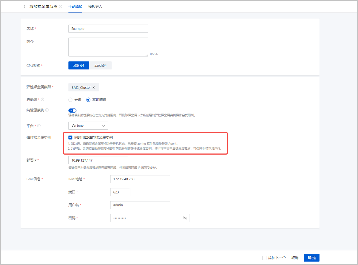 目前,仅当节点使用Linux操作系统、启动源为本地磁盘,且纳管原系统时,支持在不重启节点的情况下直接获取硬件信息,添加时,勾选同时创建弹性裸金属实例即可。