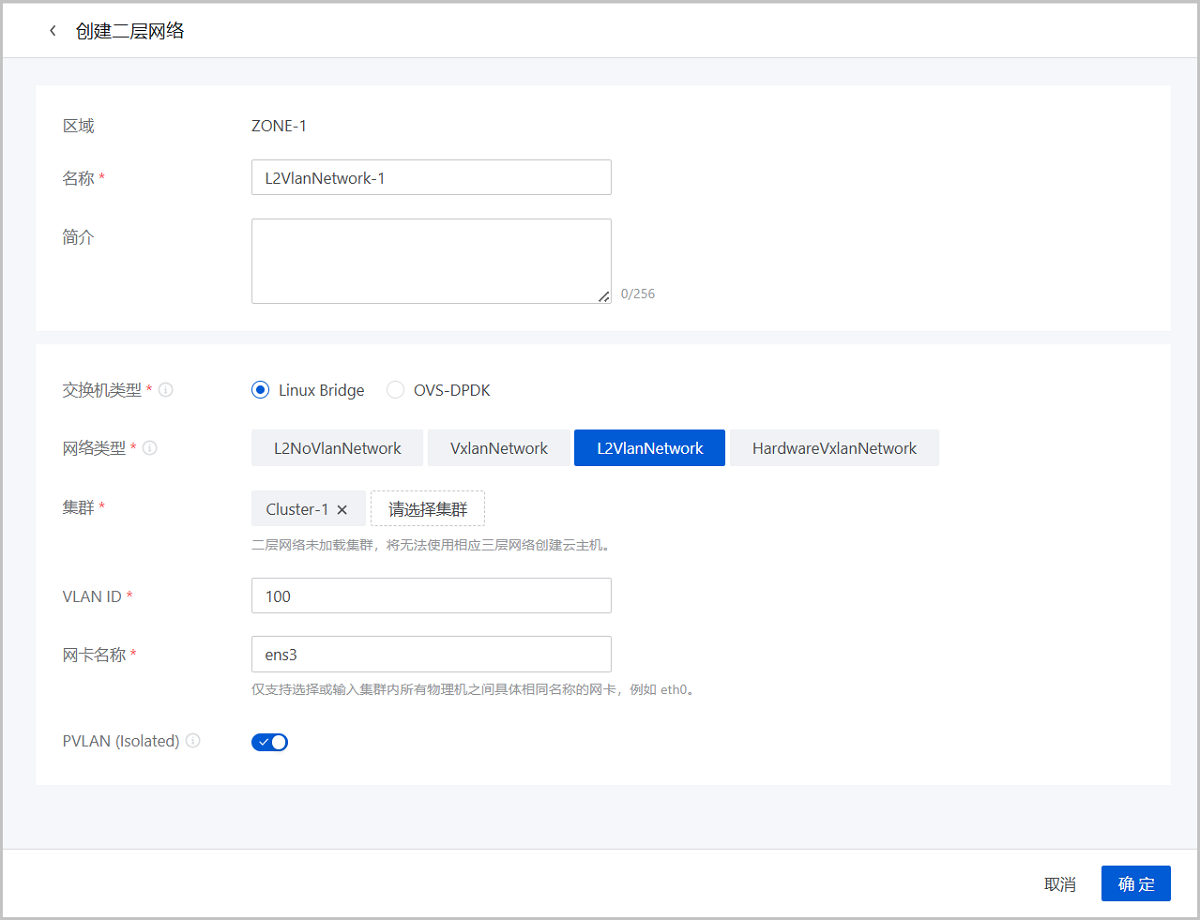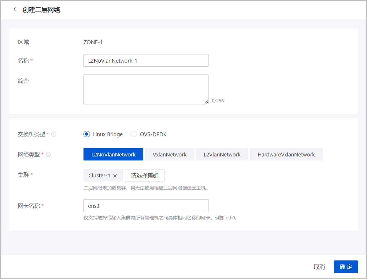 ethx格式的网卡名称会在系统重启后导致网卡顺序随机改变,尤其是带多网卡的云主机环境中,建议将各计算节点的网卡设备名称修改成非ethx格式,例如:可修改成em01格式。在ZStack Cloud主菜单,点击,进入二层网络界面。点击创建二层网络,弹出创建二层网络界面。