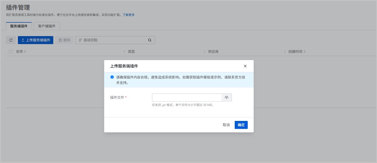 在插件管理界面,点击服务端插件,进入服务端插件界面。点击上传服务端插件,弹出上传服务端插件界面。