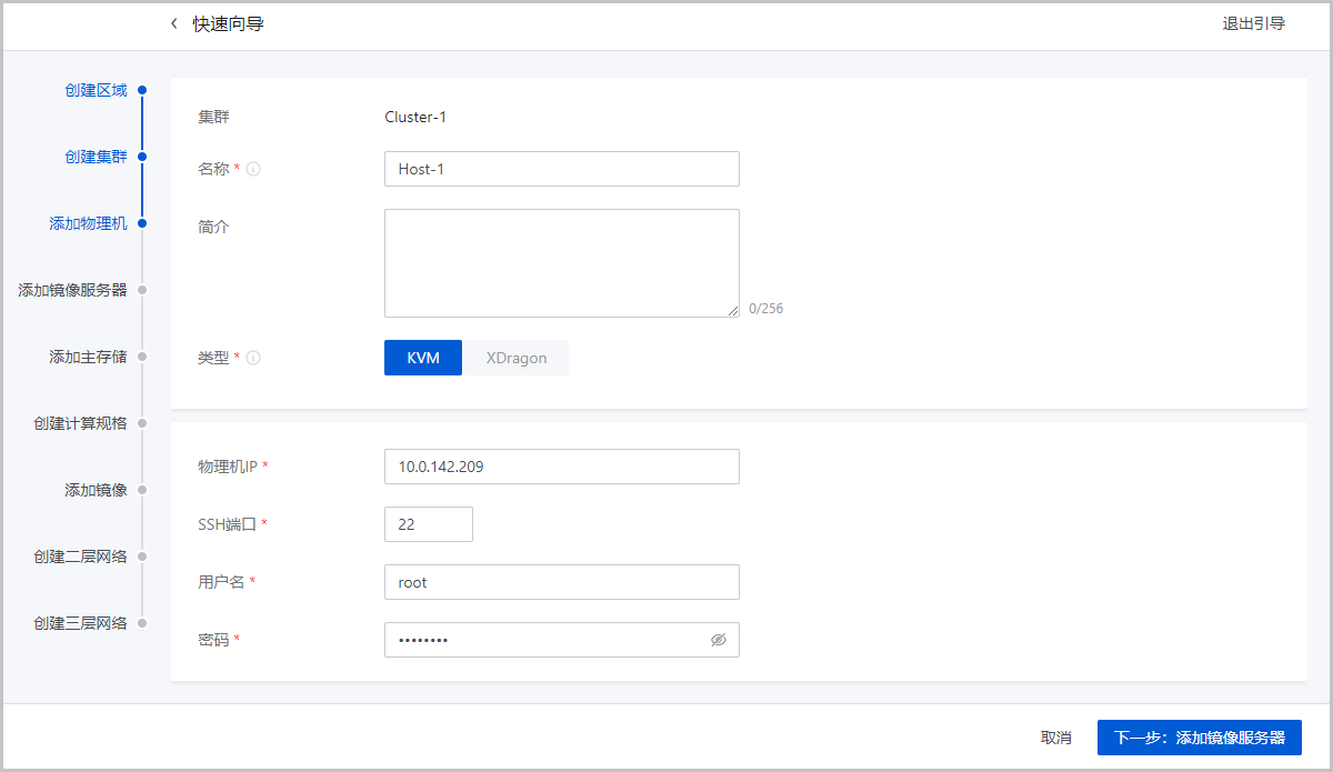 若Wizard引导设置结束后,要在同一区域的同一集群中再添加其它物理机,则对应主机需安装相同的操作系统。SSH端口、用户名、密码无须相同。