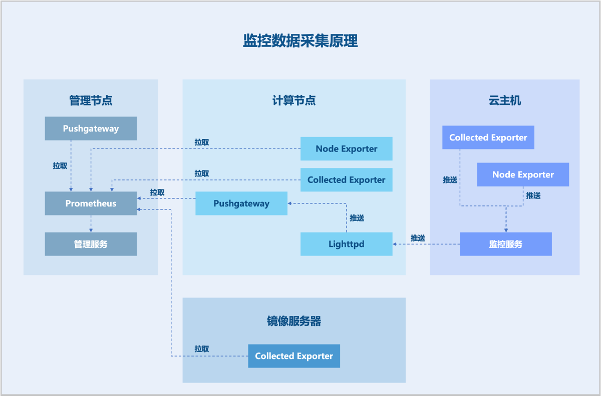 在Prometheus架构设计中,Prometheus服务器并不直接服务监控特定目标,其主要负责数据的收集、存储,并对外提供数据查询支持。因此,为监控到样本数据,如:物理机CPU使用率,需通过Exporter周期性采集监控样本。云平台针对不同监控目标,分别使用拉取模式和推送模式来采集监控数据。当物理机或云主机外部监控作为监控目标时,Prometheus服务会周期性使用拉取模式采集物理机上Exporter收集到的数据。