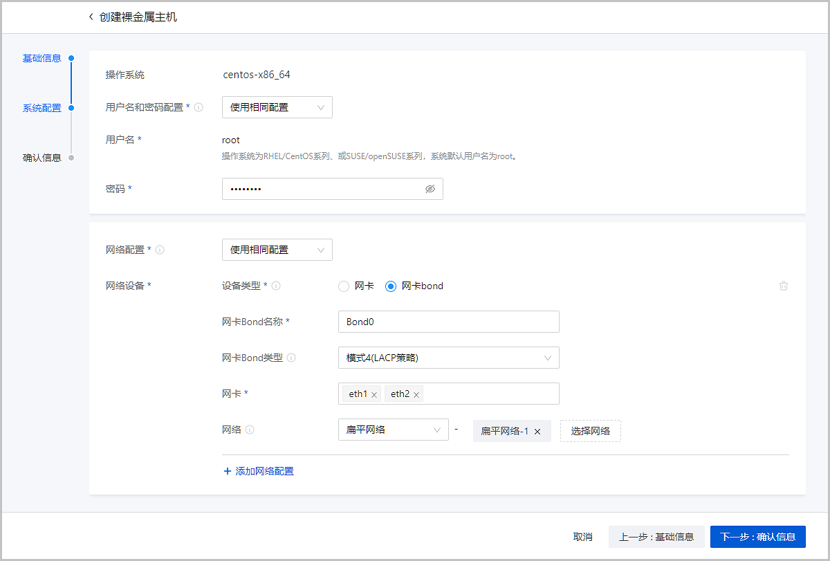 在裸金属集群界面,选择已创建的裸金属集群,点击,选择已提前规划好的L2-扁平网络,加载到裸金属集群。