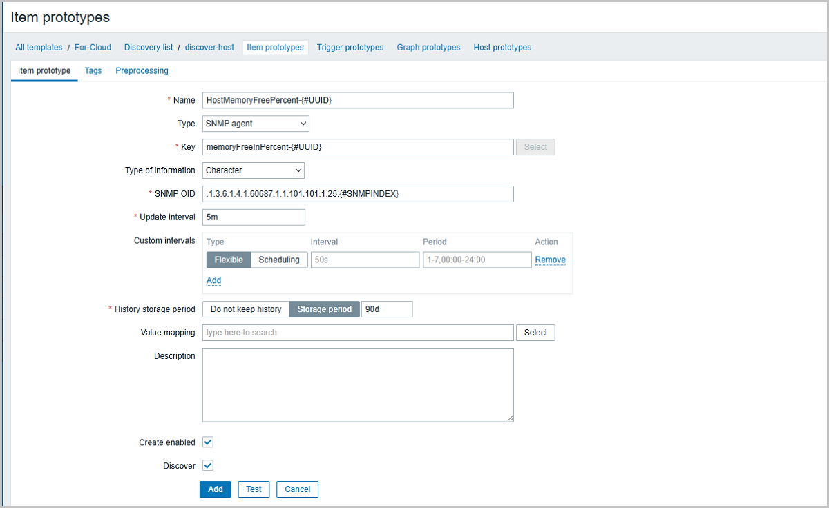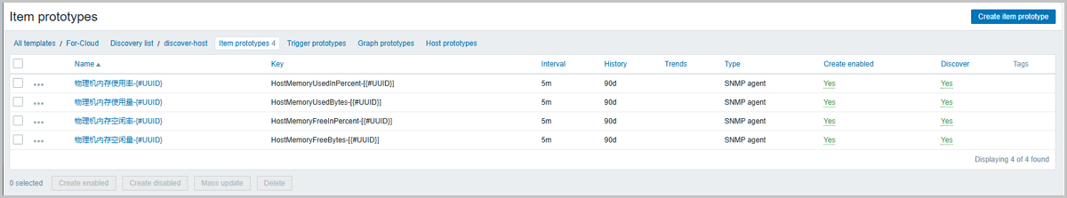 在Template主列表,选择For-Cloud模板下从创建好的发现规则discover host,进入发现规则详情页,点击,为发现规则添加监控项原型,ZABBIX会根据发现规则和监控项原型为ZStack Cloud上的资源自动、批量生成监控项。