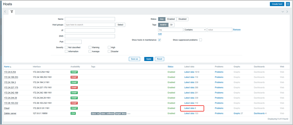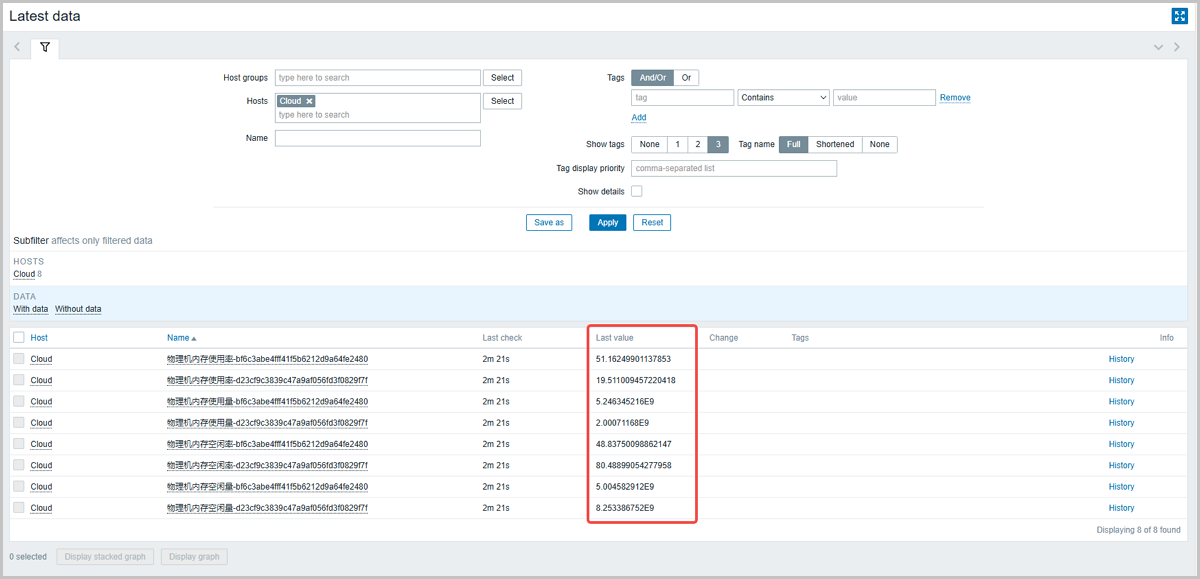 通过批量对接,ZABBIX可获取ZStack Cloud上一类或几类资源的监控数据,例如获取所有物理机的监控数据: