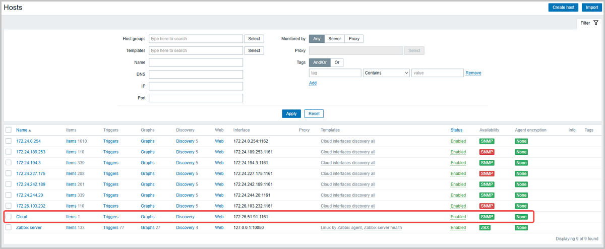 绑定完成后,在ZABBIX主菜单,点击,在Hosts界面,选择ZStack Cloud对应的主机,并查看其Items列,可以发现系统已根据模板发现规则和监控项原型,为ZStack Cloud中的每台物理机各生成了4条监控项。