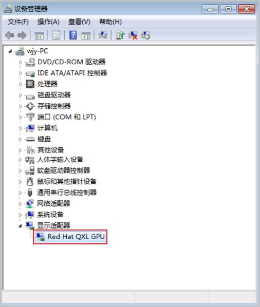 右击原图形驱动,点击更新驱动程序 > 浏览计算机查找驱动程序软件 > 从计算机的设备驱动程序列表中选取 > 从磁盘安装,在virtioCD驱动器选择对应驱动目录,例如:D:\qxl\win7\amd64,点击确定 > 下一步,安装后如图 4所示: