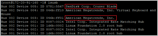 打开云主机控制台,执行lsusb命令,查看成功加载到云主机的USB设备。如图 3所示: