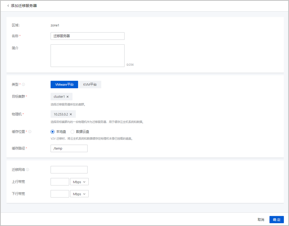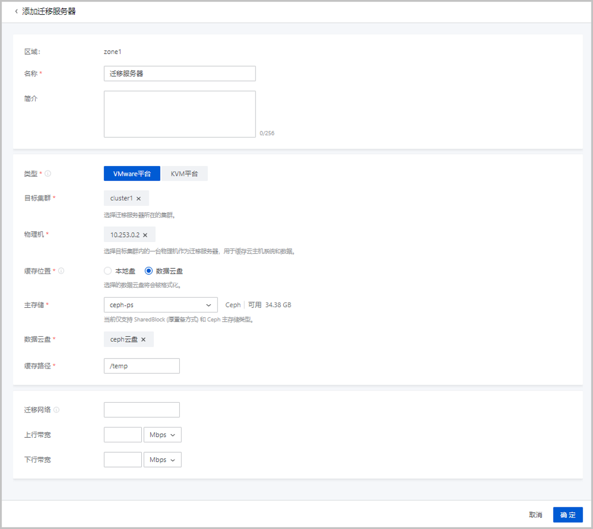 • 上行带宽:可选项,设置迁移服务器的上行带宽,将限制从迁移服务器到目标主存储的上传速度,需输入整数,单位:Mbps/Gbps,取值范围:1024 Mbps~32 Gbps。