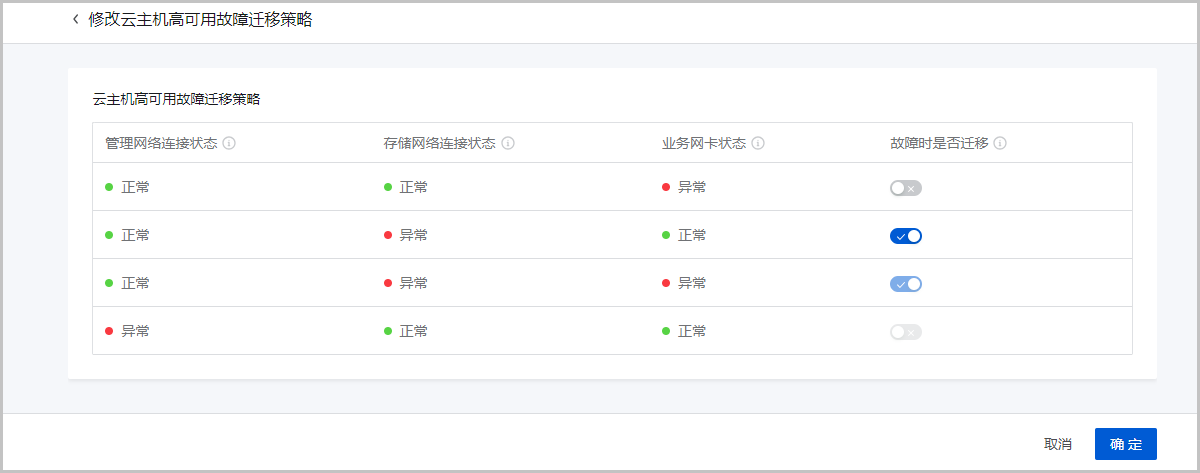 场景假定:用户在物理机Host A上部署4台业务云主机承载MySQL数据库服务,要求物理机Host A业务网卡故障时,所有4台云主机迁移至其他物理机,以保障业务高可用。此场景下,可将这些云主机高可用模式均设置为NeverStop,且设置业务网卡状态故障时触发迁移,并确保云平台内物理机资源充足。