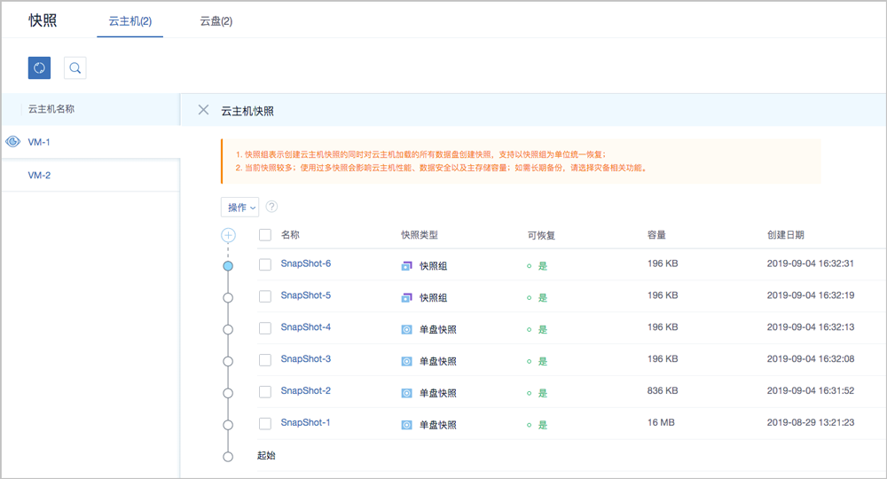 在生产环境中,建议单块磁盘的快照数量尽量控制在5以内,快照过多会影响云主机/云盘的IO性能、数据安全以及主存储容量。不建议进行高频的定时快照备份。如需长期备份,请选择灾备相关功能。