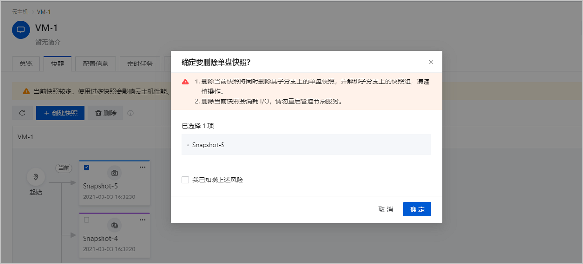 以删除某一云主机单盘快照为例,在ZStack Cloud主菜单,点击,进入云主机界面,选择某一云主机(运行中/已暂停/已停止),在云主机详情页的快照子页面,选择某一单盘快照,执行删除操作,弹出删除快照确认框。
