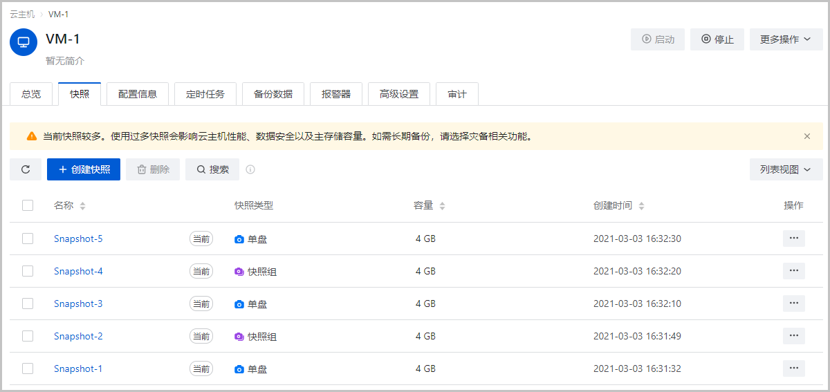 在生产环境中,建议单块磁盘的快照数量尽量控制在5以内,快照过多会影响云主机的I/O性能、数据安全以及主存储容量。如需长期备份,建议使用灾备服务。