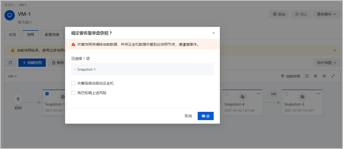 在ZStack Cloud主菜单,点击,进入云主机界面。选择某一云主机(已停止),在云主机详情页的快照子页面,选择某一单盘快照,点击恢复,弹出恢复快照确认框。