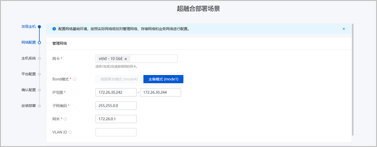 配置网络基础环境,按照实际网络规划对管理网络、存储网络、业务网络、BMC网络进行配置。