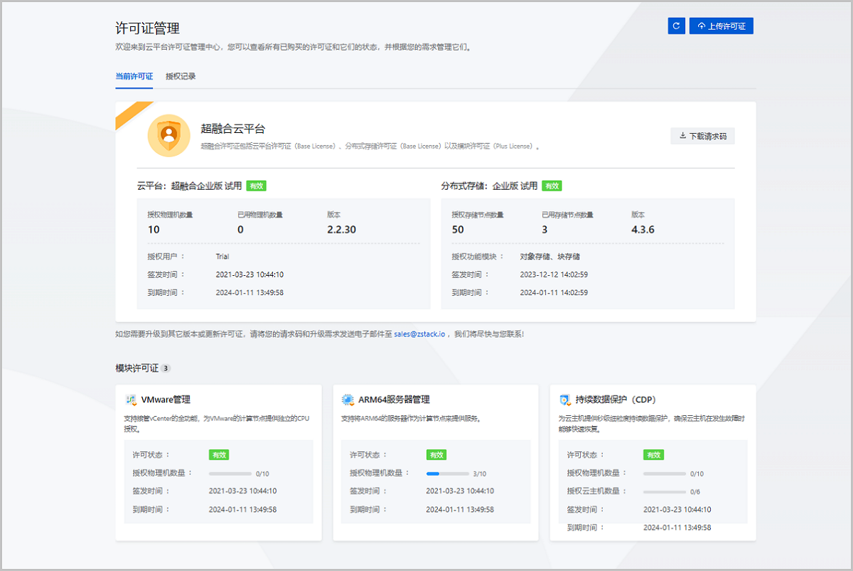 ZStack Cube超融合一体机使用超融合许可证。在ZStack Cube主菜单,点击 ,进入许可证管理界面。许可证管理界面显示当前软件的授权协议、软件版本、授权状态等信息,并提供许可证的统一管理,包括超融合许可证(Base License)、分布式存储许可证(Base License)以及模块许可证(Plus License)。
