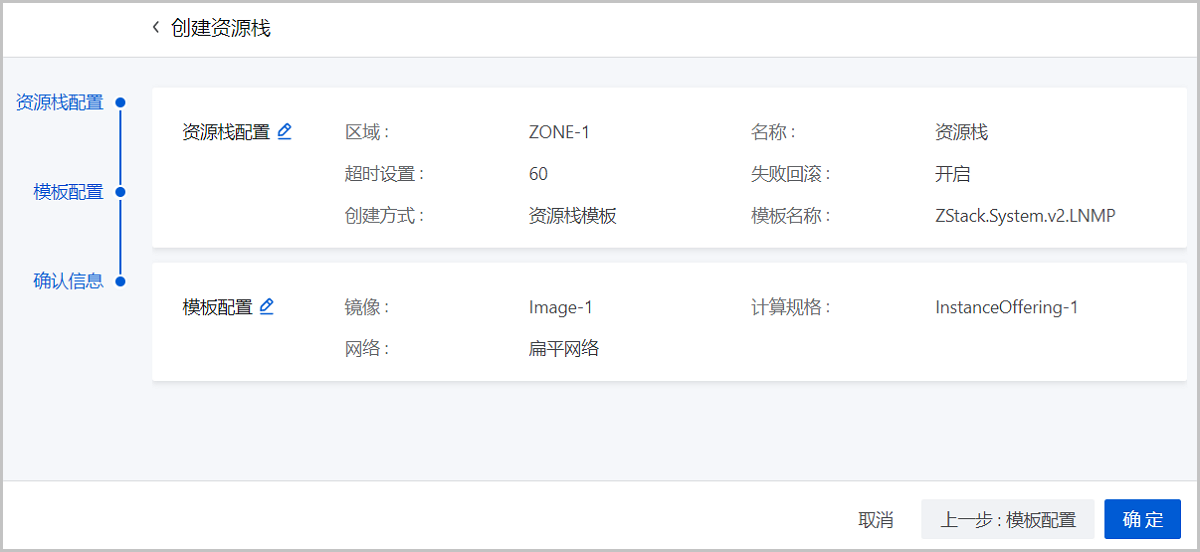 在ZStack Cube 旗舰版主菜单,点击,进入资源栈界面。点击创建资源栈,弹出创建资源栈界面。