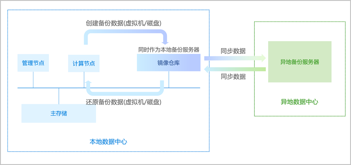 支持将异地机房的存储服务器作为异地备份服务器,用于存放本地虚拟机/磁盘的定时备份数据。备份数据需通过本地备份服务器同步至异地备份服务器。