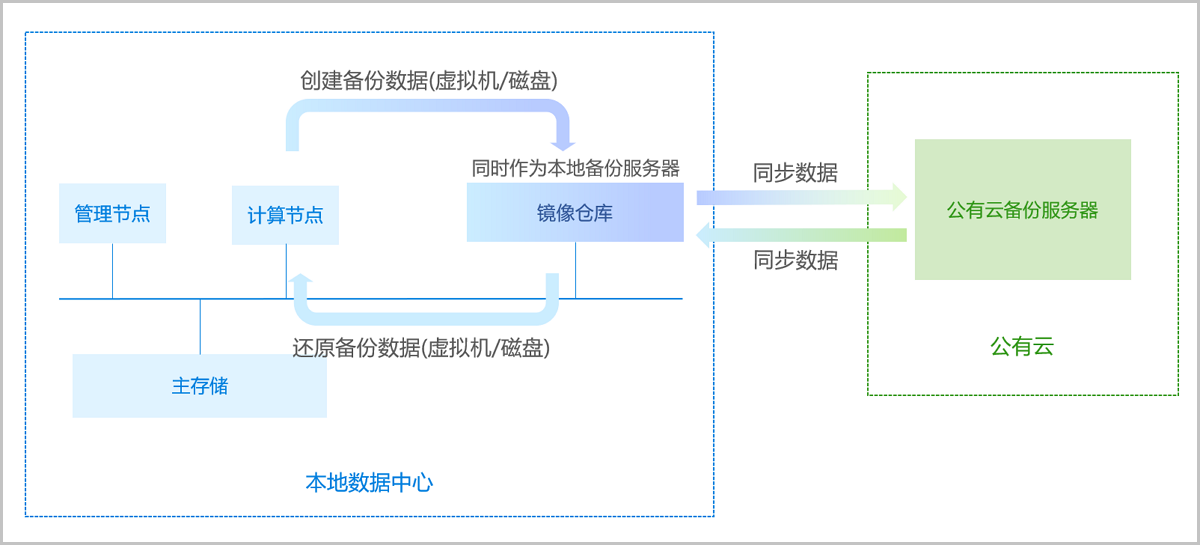 支持将公有云上的存储服务器作为公有云备份服务器,用于存放本地虚拟机/磁盘的定时备份数据。备份数据需通过本地备份服务器同步至公有云备份服务器。