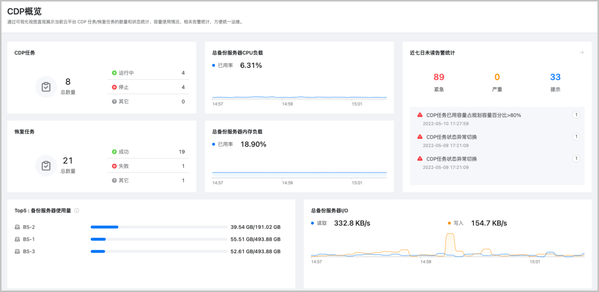 CDP概览页以卡片方式展示任务状态统计(CDP任务、恢复任务)、备份服务器负载趋势(CPU、内存)、备份服务器使用量TOP排行、备份服务器磁盘I/O统计、近七日未读告警统计等信息,方便统一运维。