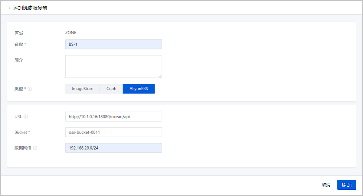 在ZStack Cube 双引擎版主菜单,点击,进入镜像服务器界面。点击添加镜像服务器,弹出添加镜像服务器界面。