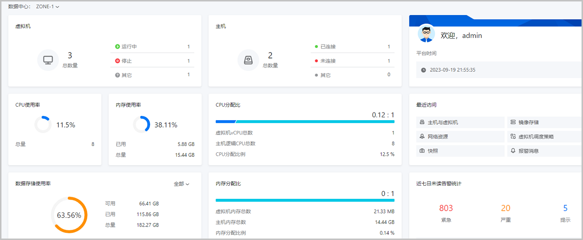 若您作为运维管理员,希望查看某一个数据中心下核心物理和虚拟资源使用情况、告警统计、登录等信息,可导航至页面,在左上角选择希望查看的数据中心,例如Datacenter-1。