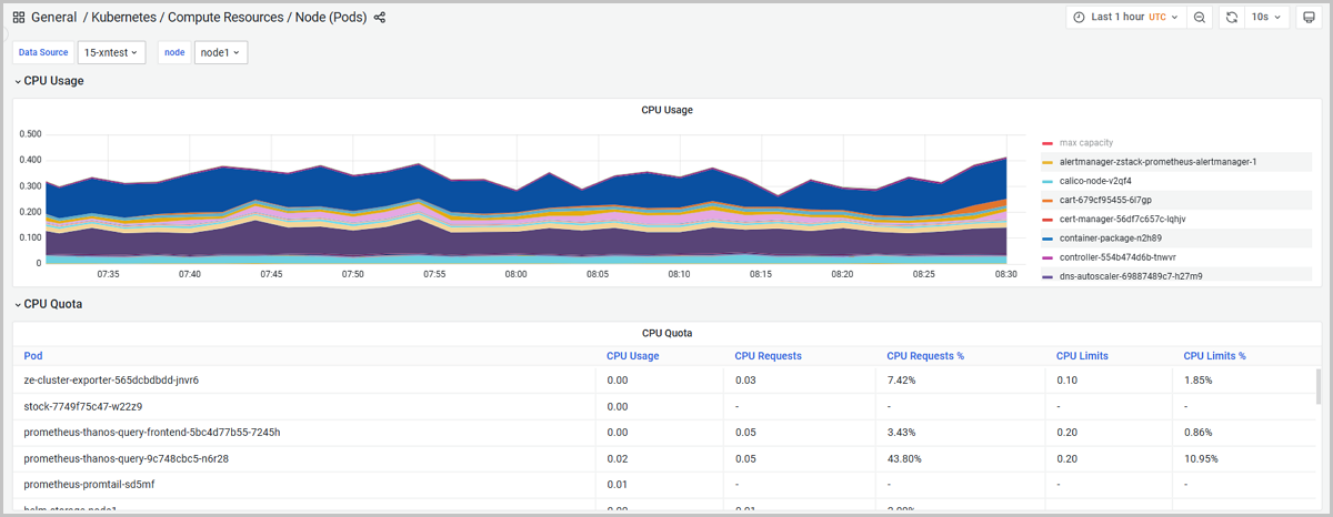进入Kubernetes / Compute Resources / Node(Pods)监控面板,可查看单台节点上容器组的CPU和内存使用情况。