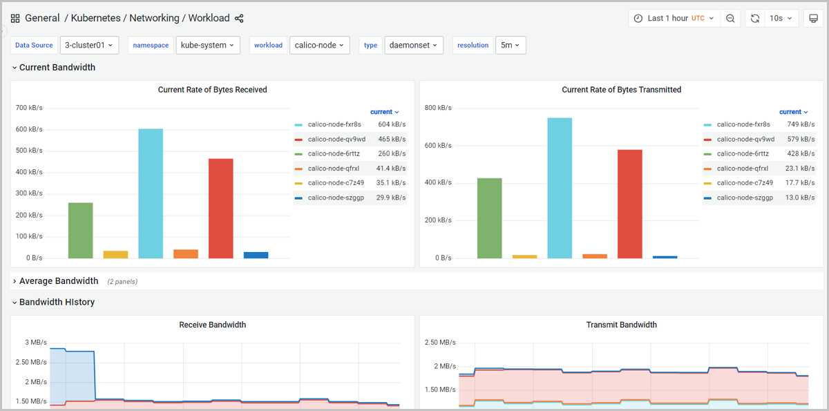 进入Kubernetes / Networking / Workload监控面板,可查看单个工作负载网络资源使用情况。