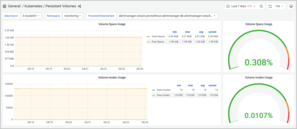 进入Kubernetes / Persistent Volumes监控面板,可查看单个数据卷存储使用率和存储使用量。