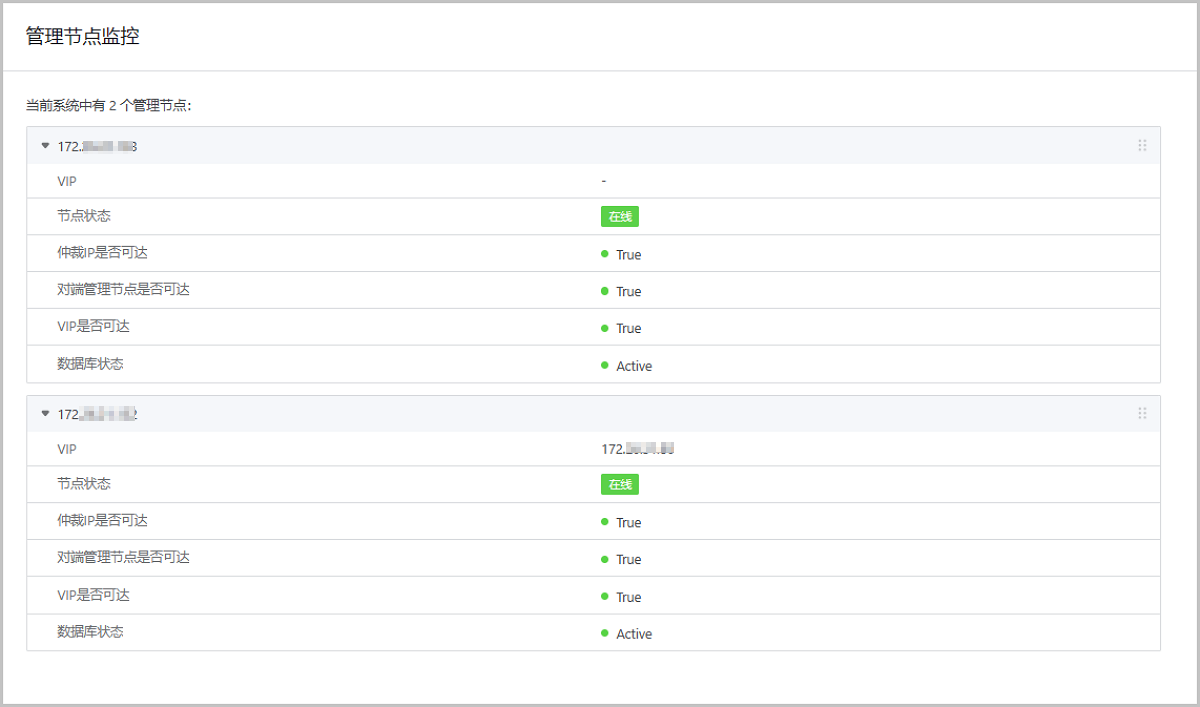 在多管理节点主机高可用场景下,可直观查看每个管理节点的健康状态。