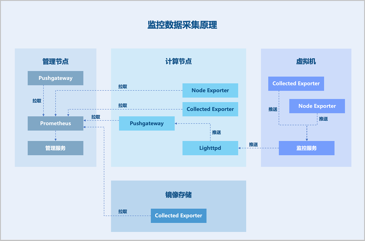 在Prometheus架构设计中,Prometheus服务器并不直接服务监控特定目标,其主要负责数据的收集、存储,并对外提供数据查询支持。因此,为监控到样本数据,如:主机CPU使用率,需通过Exporter周期性采集监控样本。ZStack ZSphere针对不同监控目标,分别使用拉取模式和推送模式来采集监控数据。当主机或虚拟机外部监控作为监控目标时,Prometheus服务会周期性使用拉取模式采集主机上Exporter收集到的数据。另外,由于网络问题或安全问题,Prometheus无法直接访问到虚拟机内部。此时需一个pushgateway作为中间者完成中转工作。采集端仍通过Exporter采集监控数据, 并采用推送方式周期性将数据推送给pushgateway,随后Prometheus采用拉取方式采集pushgateway数据,从而完成数据的统一收集。