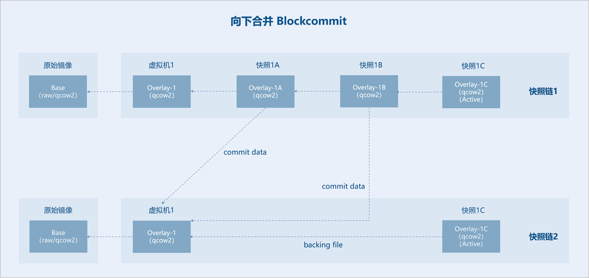 外部快照之间互相依赖(每一个overlay依赖它的backing file),每个快照保存有相应数据,不可直接删除某个快照来缩短链长度。外部快照可通过向下合并(Blockcommit)或向上合并(Blockpull)两种方式来缩短链长度。